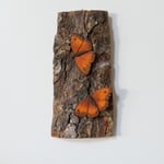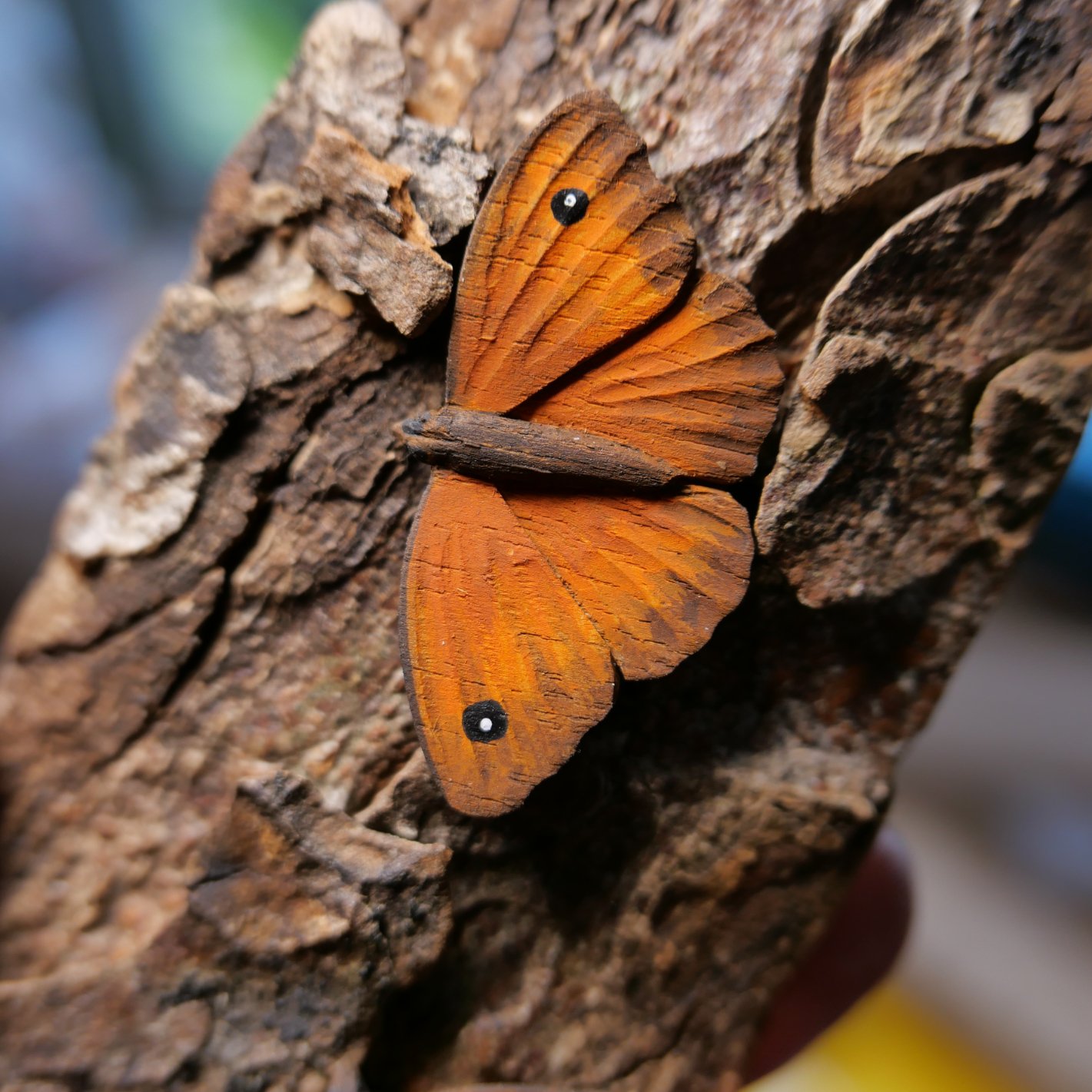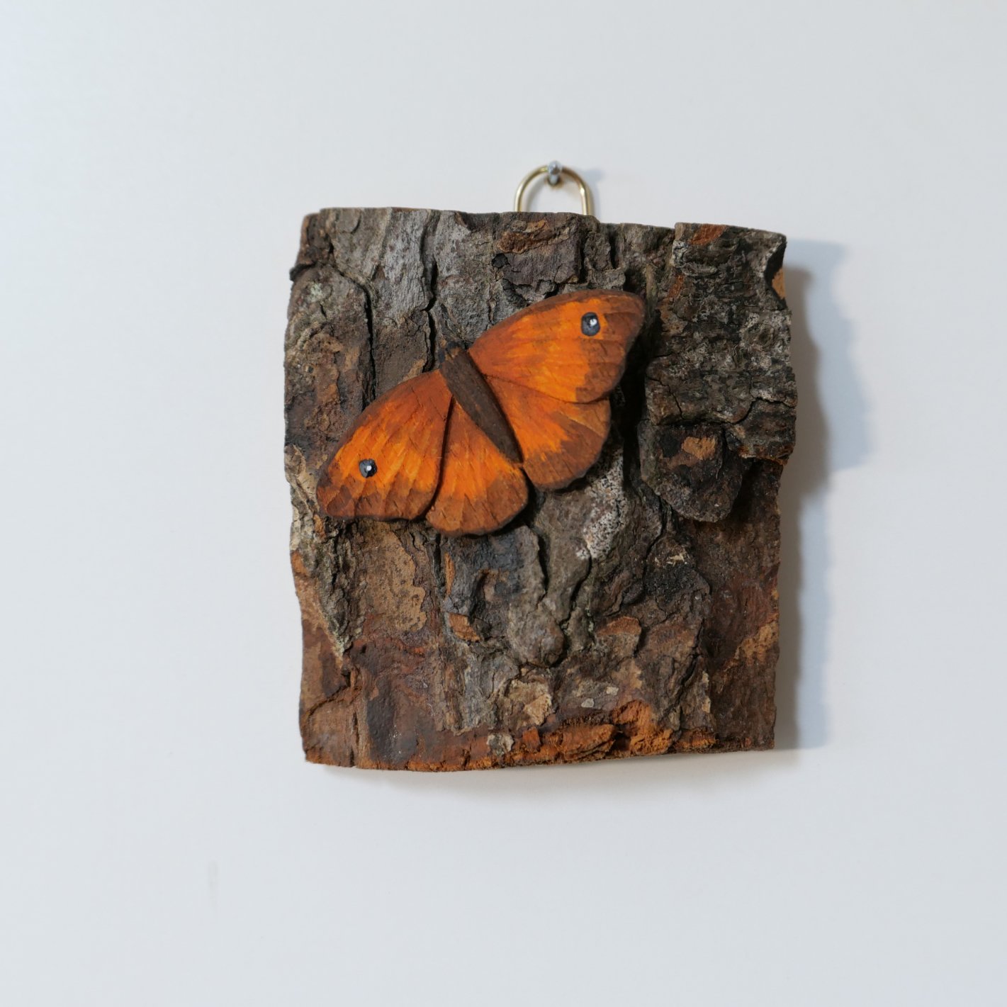 Carved and painted, mounted on bark. Lifesize.